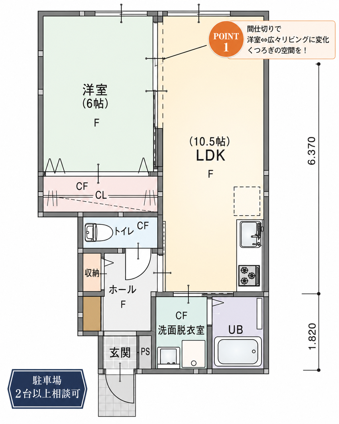 お部屋は、洋室6帖+LDK10.5帖の1LDK。